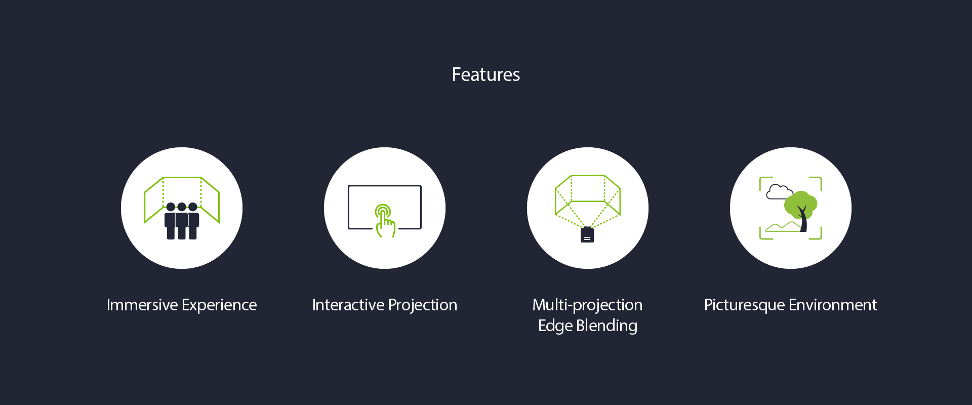 An indoor immersive room, in 5m x 5m floor size, to let guests enjoy the pleasure that seasons bring. Six Projectors are installed to create 360 degree immersive environment. 4 Seasons environment and 2 glitter effects are created in software content.